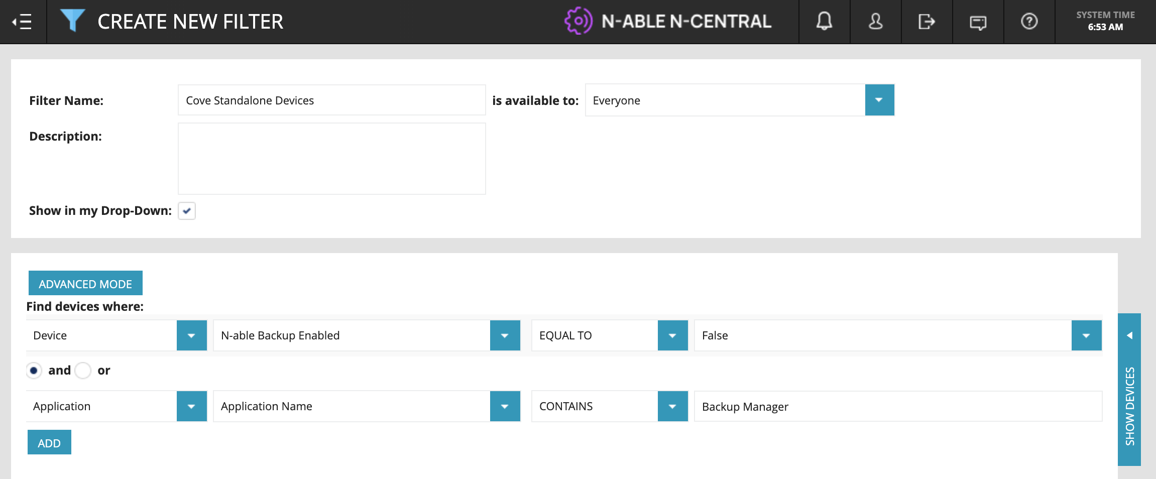 Check out an example of the settings you can use to build a filter for standalone Cove Data Protection devices in the screenshot below.