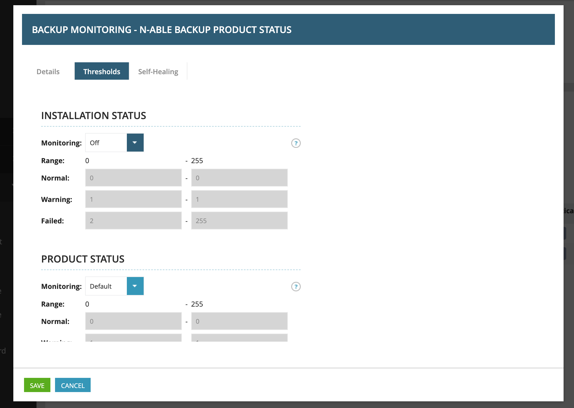 Applying the default templates will always flag a warning, as the service item “Installation Status” under the service “Backup Product Status” will state the product is not managed. To clear this, I recommend cloning the existing default templates, renaming the clones for standalone, and switching off the threshold for “Installation Status” under the service “Backup Product Status” in each of the three templates.